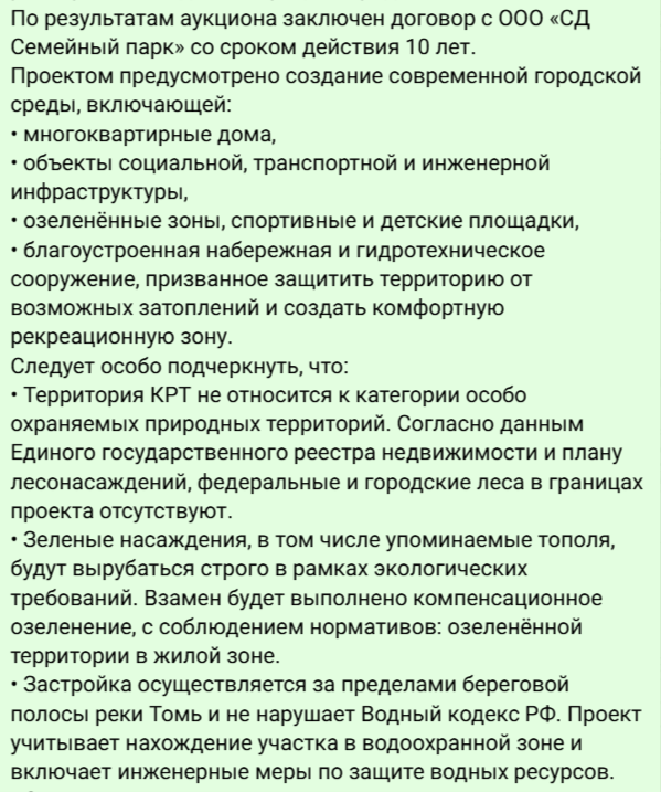 «С учётом предполагаемой нагрузки на транспортную инфраструктуру, в Генеральном плане города до 2044 года запланирована реконструкция улицы Запорожская и мостового перехода через реку Томь. Важно отметить, что на момент принятия решения территория представляла собой неблагоустроенный участок, не предназначенный для безопасного отдыха. В результате реализации проекта появятся новые общественные пространства, а также будет обеспечена защита как новой, так и существующей застройки от негативного воздействия паводков».