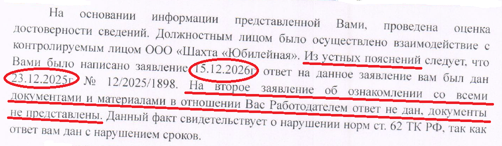 За защитой своих прав Ногих обратился в Государственную инспекцию труда. На днях горняку пришёл ответ по результатам проверки. По мнению экспертов, документ не только показывает формальный подход к проведению проверки, но даже составлен с грубыми ошибками. К примеру, перепутаны даты.