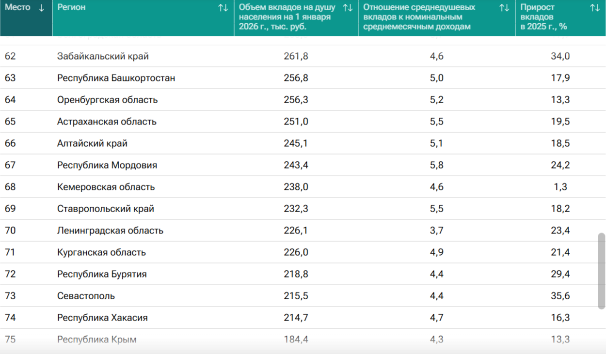 Кузбасс занял 68‑ое место в России по объёму банковских вкладов на душу населения - такие итоги подвели эксперты РИА «Рейтинг» в начале 2026 года, опираясь на данные Центробанка и Росстата.