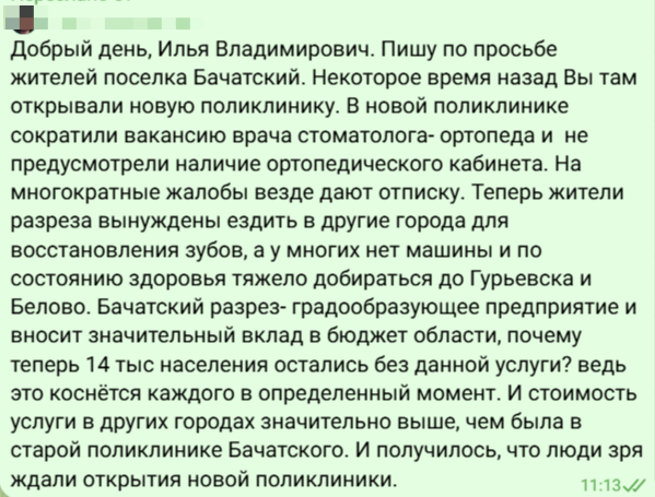 В социальных сетях губернатора Кузбасса Ильи Середюка появилась жалоба жительницы поселка Бачатский на сокращение вакансии врача стоматолога-ортопеда в новой поликлинике.