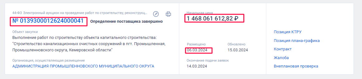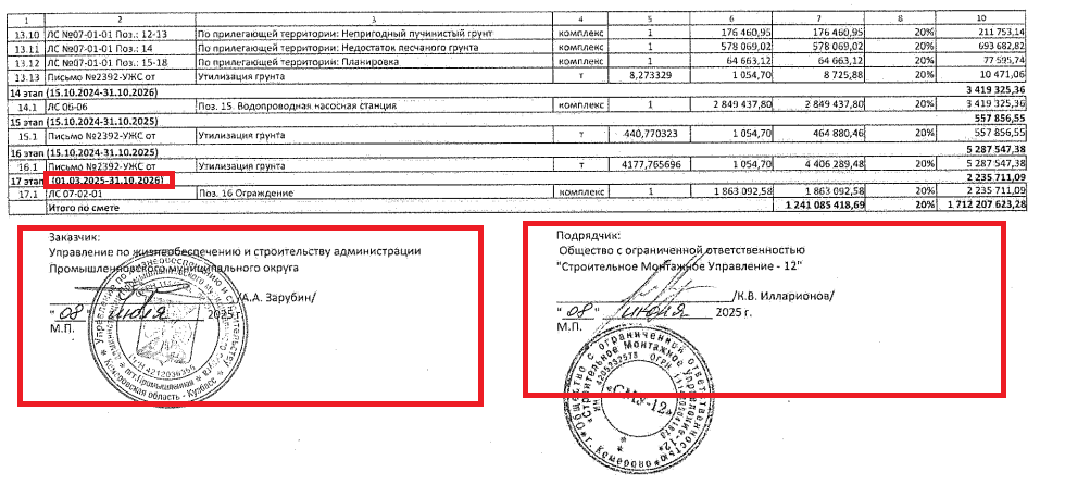Солидная цена контракта в 1,4 млрд. рублей вначале выросла до 1,7 миллиардов. А 8 июля 2025 года заказчик, управление по жизнеобеспечению и строительству администрации Промышленновского муниципального округа в лице замглавы и начальника управления Артёма Зарубина, и подрядчик, ООО "СМУ-12" в лице директора Константина Илларионова, заключили допсоглашение, в котором сроки сдачи объекта указаны иные - 15 декабря 2026 года.