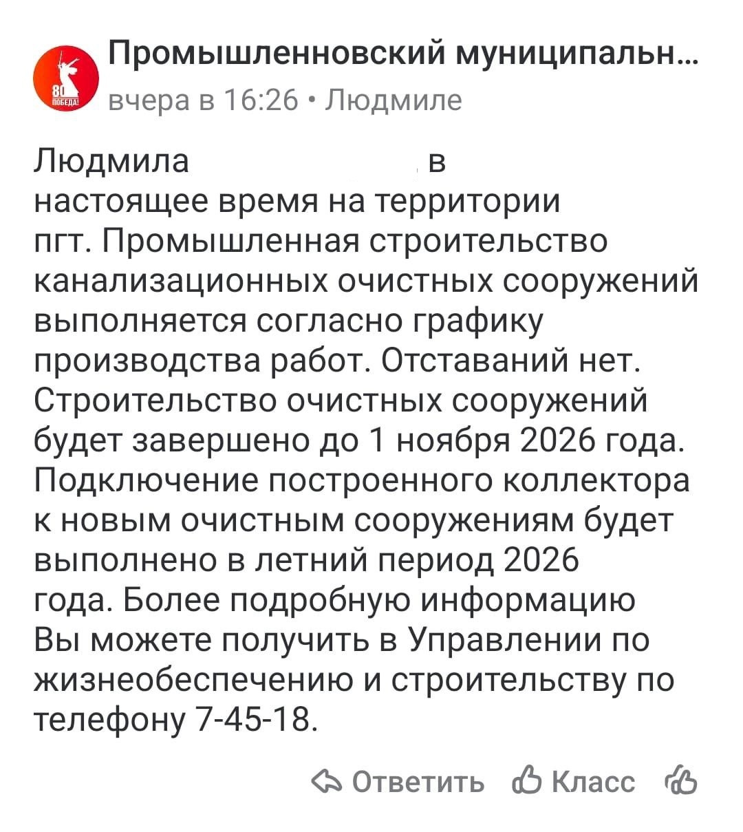 В марте 2024 года на сайте госзакупок была размещена информация о проведении электронного аукциона на строительство очистных сооружений в пгт Промышленная. Победителем стало ООО "СМУ-12". Объект планировали построить до 31 октября 2025 года.