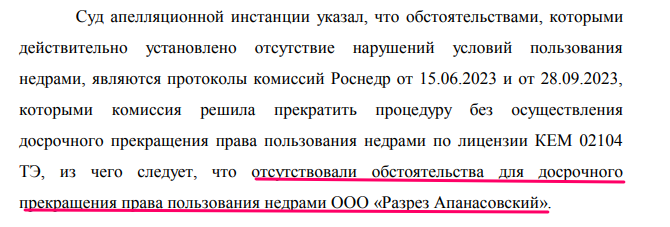 Правительство Кузбасса обратилось в Роснедра и в 2023 году ведомство отказало ООО "Разрез Апанасовский" в продлении лицензии. Однако Арбитражный суд Москвы в марте 2025-го признал это решение незаконным. Кассационная инстанция подтвердила решение в пользу разреза.