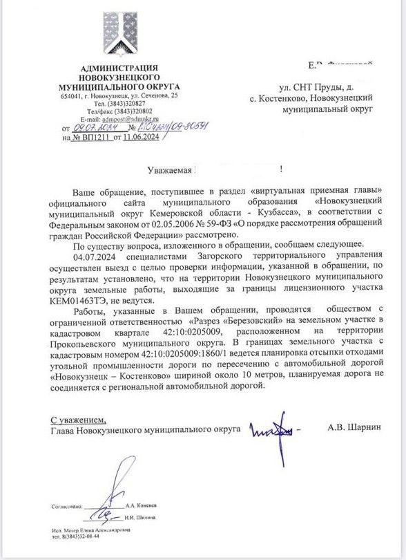 Администрация Новокузнецкого района вновь на стороне угольщиков. Подтверждением тому два письма за подписью одного и того же человека – главы района А.В.Шарнина. В июне 2020 года он сообщает о том, что собственником земельных участков, на которых расположена дорога (разрез «Березовский») ведется работа по ее передаче в собственность региона.