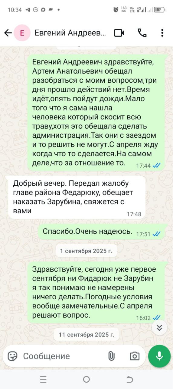 Весной текущего года, когда уровень воды в подполье дома вновь поднялся до критических отметок, Надежда обратилась к Артему Зарубину. Чиновник пообещал обновить водоотводную канаву, которая проходит по огороду Саютиной, а позже - прислать работника, который скосит на участке траву. Обещанного три года ждут, но терпение Надежды лопнуло в конце августа.