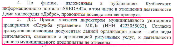 После публикаций администрация города сообщила "Среде", что ранее действовавшее МУП "Прокопьевская специализированная служба по вопросам похоронного дела" ликвидировано, а полномочия переданы МКУ "Служба жилищно-коммунального хозяйства и благоустройства".