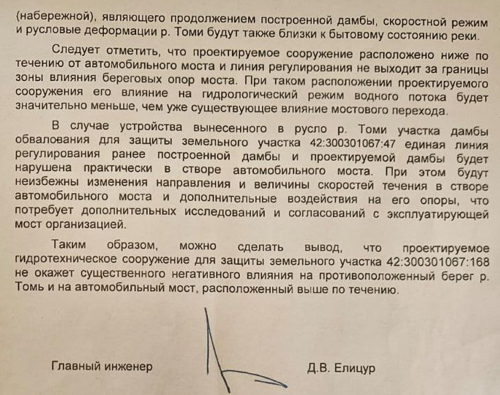Ответ ЗАО "Сибречпроекта" завершается вообще эпично! В случае устройства, вынесенного в русло р. Томи участка дамбы обвалования для защиты земельного участка 42:300301067:47 (участок, где сейчас находятся спасатели – прим.автора), единая линия регулирования ранее построенной дамбы и проектируемой дамбы будет нарушена практически в створе автомобильного моста (Кузнецкий мост – прим.автора). При этом будут неизбежны изменения направления и величины скоростей течения в створе автомобильного моста и дополнительные воздействия на его опоры, что потребует дополнительных исследований и согласований с эксплуатирующей организацией.