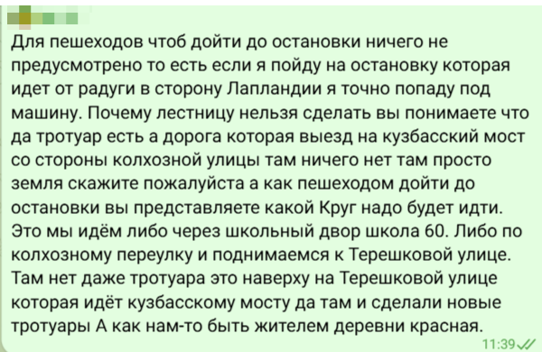 Как высказалась одна из жительниц деревни, когда начался ремонт Кузбасского моста, была убрана лестница, которая находилась около школы №60 (спуск с Кузбасского моста и подъём, когда едешь в сторону проспекта Октябрьского с Радуги). При этом мост скоро откроют, а лестницы до сих пор нет, что доставляет множество неудобств пешеходам.