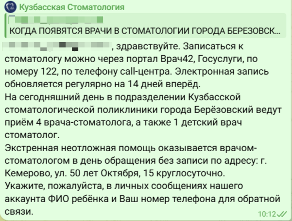 Представители медучреждения ответили на обращение и пояснили, что записаться к стоматологу можно несколькими способами: через портал Врач42, Госуслуги, по номеру 122, по телефону call-центра.