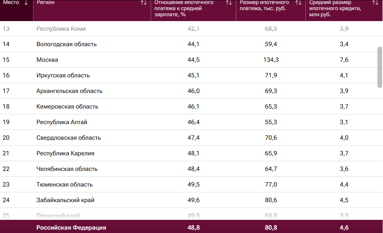 Так, эксперты составили рейтинг регионов РФ по ипотечным платежам. В качестве основного показателя выступает отношение среднего фактического ежемесячного ипотечного платежа и средней чистой (за вычетом НДФЛ) зарплаты двух работающих в регионе.