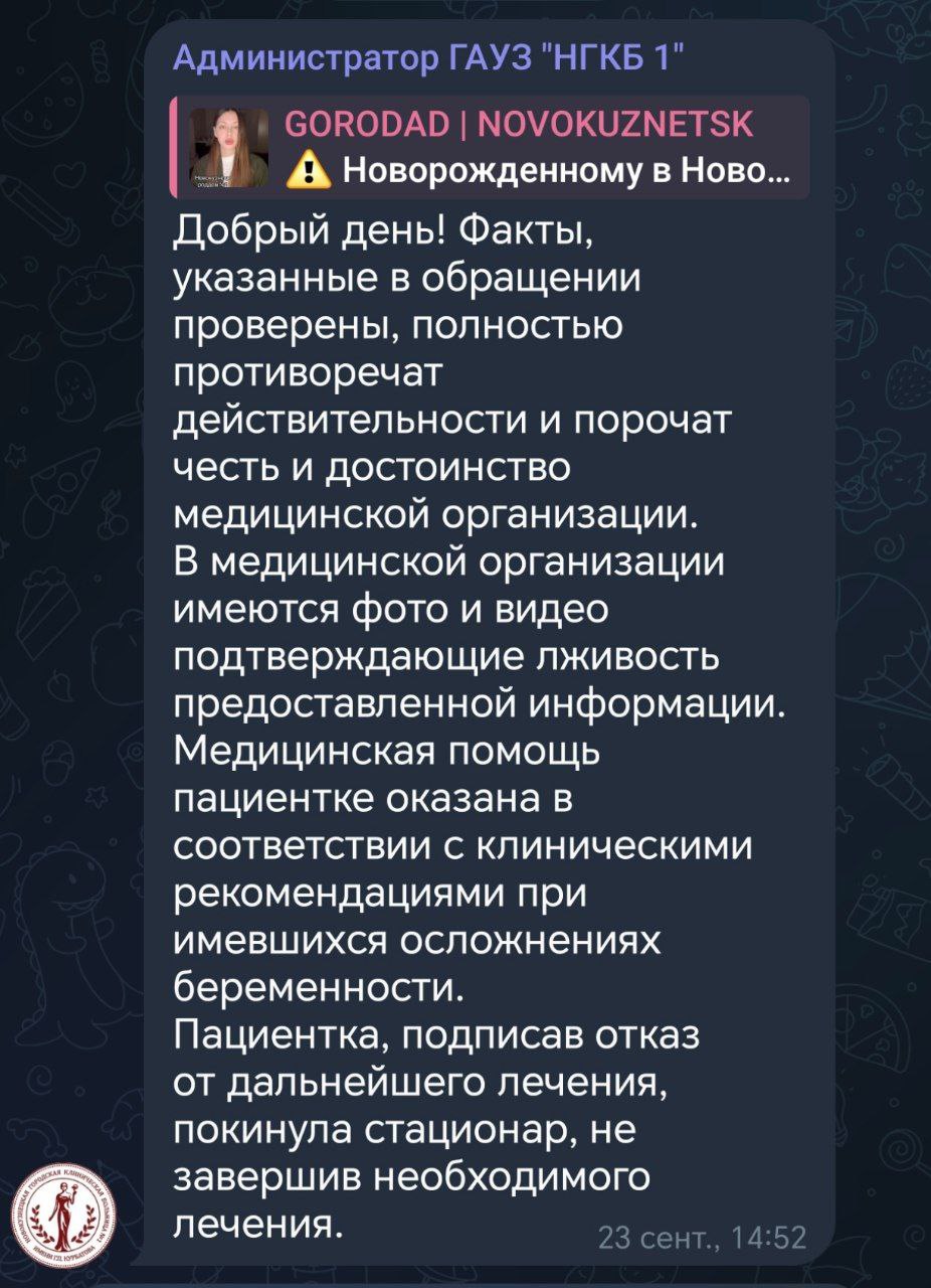 В Telegram-канале «Gorodad» новокузнечанка сообщила, что трагедия с её сестрой произошла на 21-й неделе беременности 22 сентября в роддоме Новокузнецка на улице Сеченова, когда у беременной начались схватки.