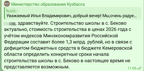 Между тем расчёты показывают: строительство школы в ценах 2026 года с учётом индексов Минэкономразвития РФ обойдётся более чем в 1,3 млрд рублей. Именно высокая стоимость проекта стала главным препятствием - региональный бюджет Кузбасса испытывает жёсткий дефицит средств, и выделить такую сумму на данный момент невозможно. В официальном ответе министерства прямо говорится, что определить конкретные сроки начала строительства сейчас не представляется возможным.