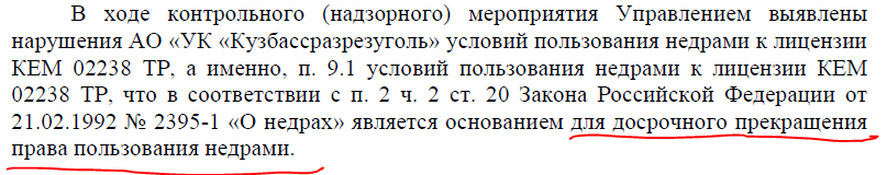 В ходе проверки специалистами Южно-Сибирского межрегионального управления Росприроднадзора выполнения условий пользования недрами к лицензии КЕМ 02238 ТР (месторождение Чексинское) АО "УК "Кузбассразрезуголь" выявлены нарушения.