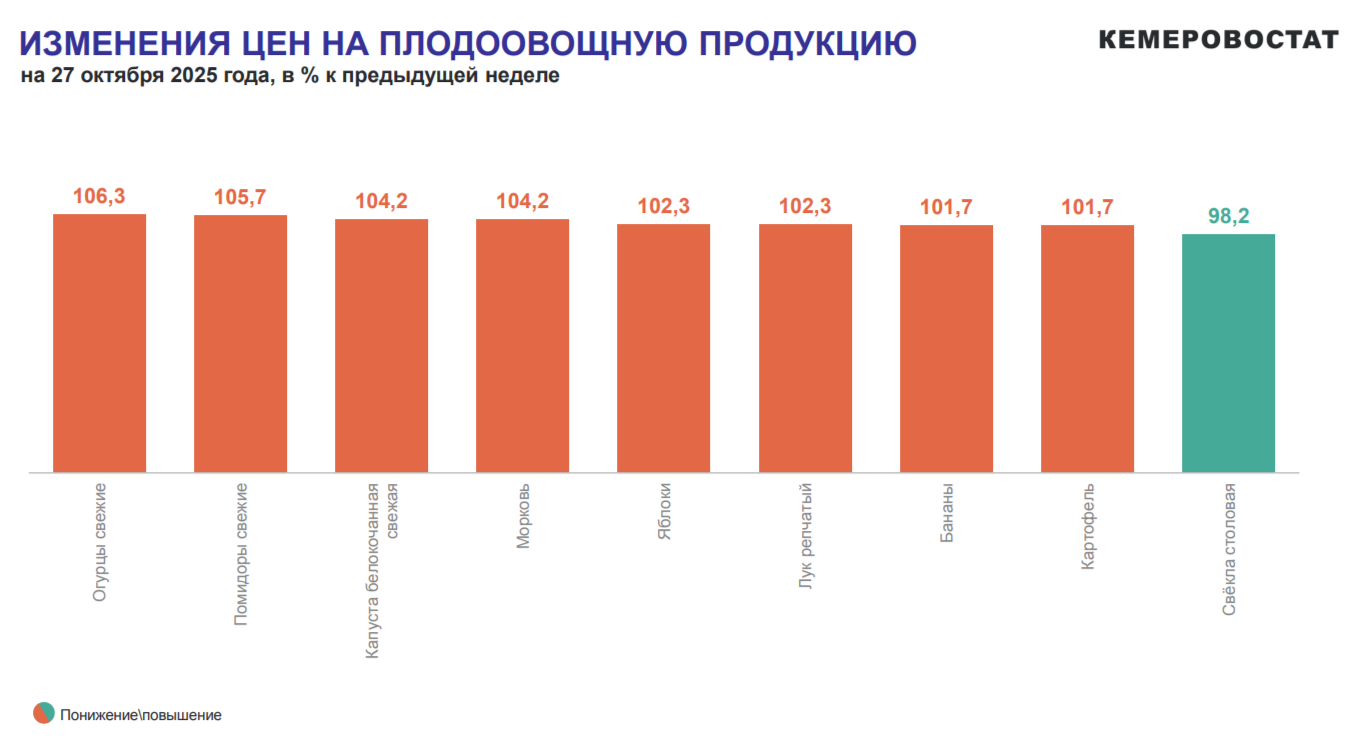 Сильнее всего за неделю выросли в цене: огурцы (+6,3%), помидоры (+5,3%), белокочанная капуста и морковь (+4,2%), яблоки и репчатый лук (+2,3%), бананы и картофель (+1,7%), вермишель и мороженая рыба (+1,6%), яйцо (+1,5%), говядина (+1,4%) и печенье (+1,2%).